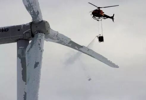 海上湿度较大,在严寒时叶片可能结冰,造成风力机发电能力下降,积冰严重时甚至可能导致叶片断裂。在高纬度地区,寒冷的冬季通常也是取暖用电高峰,而叶片结冰会损失年发电量1%~10%,极端地区甚至能达到20%~50%。为此,工程师们开发出了多种除冰方法,其中被动除冰是在叶片表面涂以特殊涂料,目前应用最广的是超疏水涂层,可降低叶片与水、冰之间的黏结性。而黑色烤漆可在白天借助阳光的热量除冰。此外,还有能够渗出可降低结冰点的抑制剂的概念涂层等尚处于实验室阶段的技术。主动除冰则是在叶片表面安装热电阻元件或加热叶片内部空气,使叶片温度处于0℃以上。高纬度地区的风力机一般需要结合主动加热和被动涂层的除冰能力。