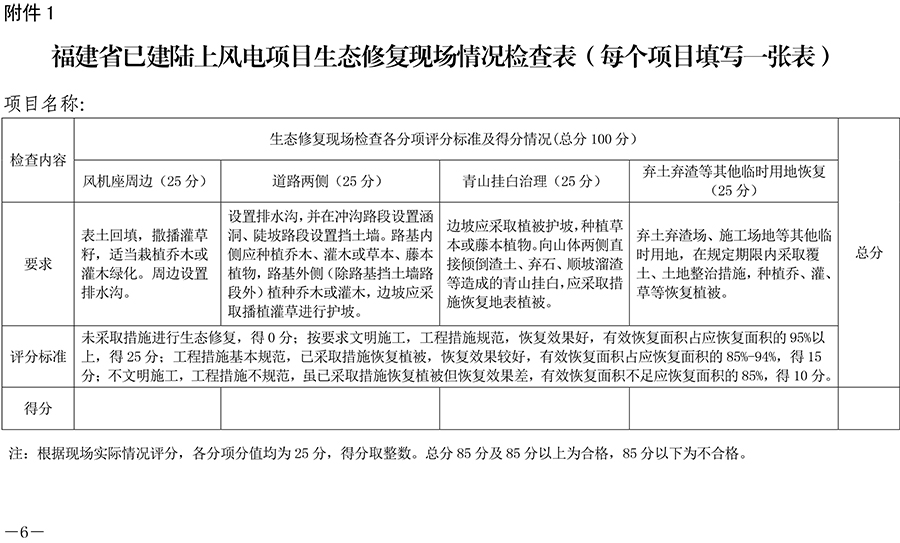 专项检查重点针对项目道路建设、风机周边防护、青山挂白治理、弃土弃渣等临时用地植被恢复情况,对生态修复等级评判分为合格、不合格二个等次。针对专项检查结果,对违法违规使用林地的风电企业,林业部门将按有关法律法规查处,发改部门将其列入失信名单。对生态修复工作不达标、效果差的,要求限期整改,对整改仍不到位的,暂停其上网电费结算。