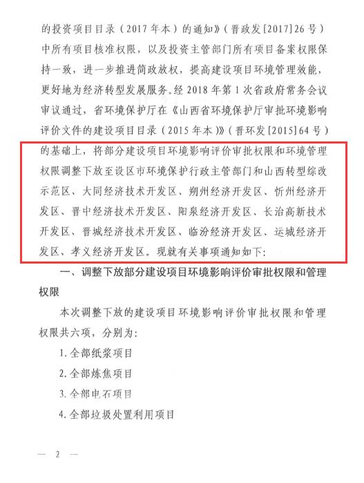 山西省环保厅近日发布《关于调整下放部分建设项目环评审批权限的通知》,本次调整下放的建设项目环境影响评价审批权限和管理权限共六项,其中包括全部风力发电项目,下放至区市环境保护行政主管部门和山西转型调整综改示范区、大同经济技术开发区、朔州经济开发区、忻州经济开发区、晋中经济技术开发区、阳泉经济开发区、长治高新技术开发区、晋城经济技术开发区、临汾经济开发区、运城经济开发区、孝义经济开发区。通知自发布之日起实施。