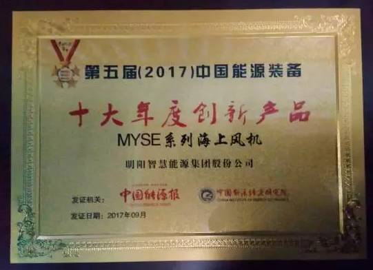9月20日,在北京召开的首届(2017)中国能源产业发展年会上,明阳MySE系列海上风机以显著的技术领先和成本优势荣膺第五届中国能源装备十大年度创新产品