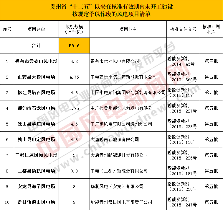 1、贵州省“十二五”以来在核准有效期内未开工建设按规定予以作废的风电项目10个,规模共计59.6万千瓦;