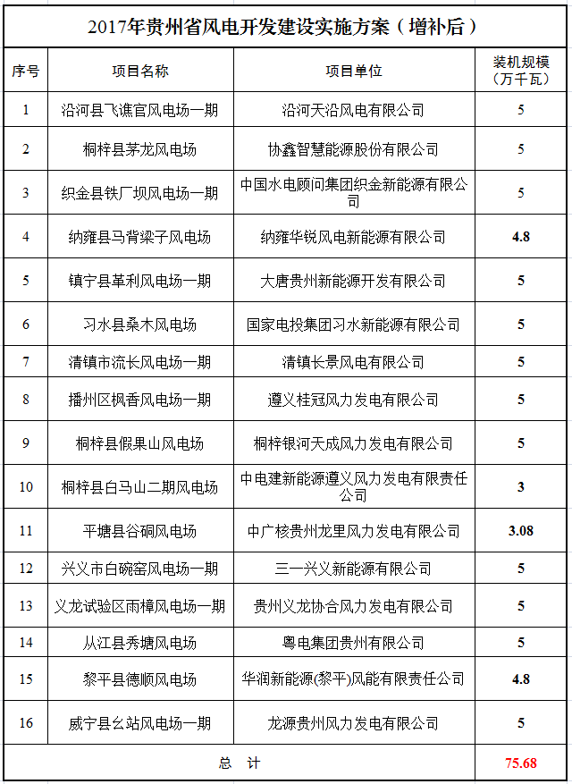 2017年12月21日,我局印发了《省能源局关于印发实施2017年贵州省风电开发建设实施方案的通知》(黔能源新能〔2017〕233号)文件,经研究,现增补威宁县幺站风电场一期项目(装机规模5万千瓦)列入《2017年贵州省风电开发建设实施方案》,增补后的项目共16个、装机规模75.68万千瓦。